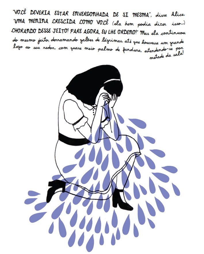Talita Hoffman redraws the story of Alice, playing with words and imagens in a beautiful graphic design. The images overflow into the text, which creates motion curves and tells the story giving a rhythm in the intentions and doing the text dance on the page in a magical puzzle. His illustrations seem simple and childish at first sight but dialogue with multiple aesthetics references of comics, popular culture, among others. They remind me of the illustrations of Lewis Carroll himself, who seem primitive, but show great expressiveness and poetry, in a game between delicacy and surprise.